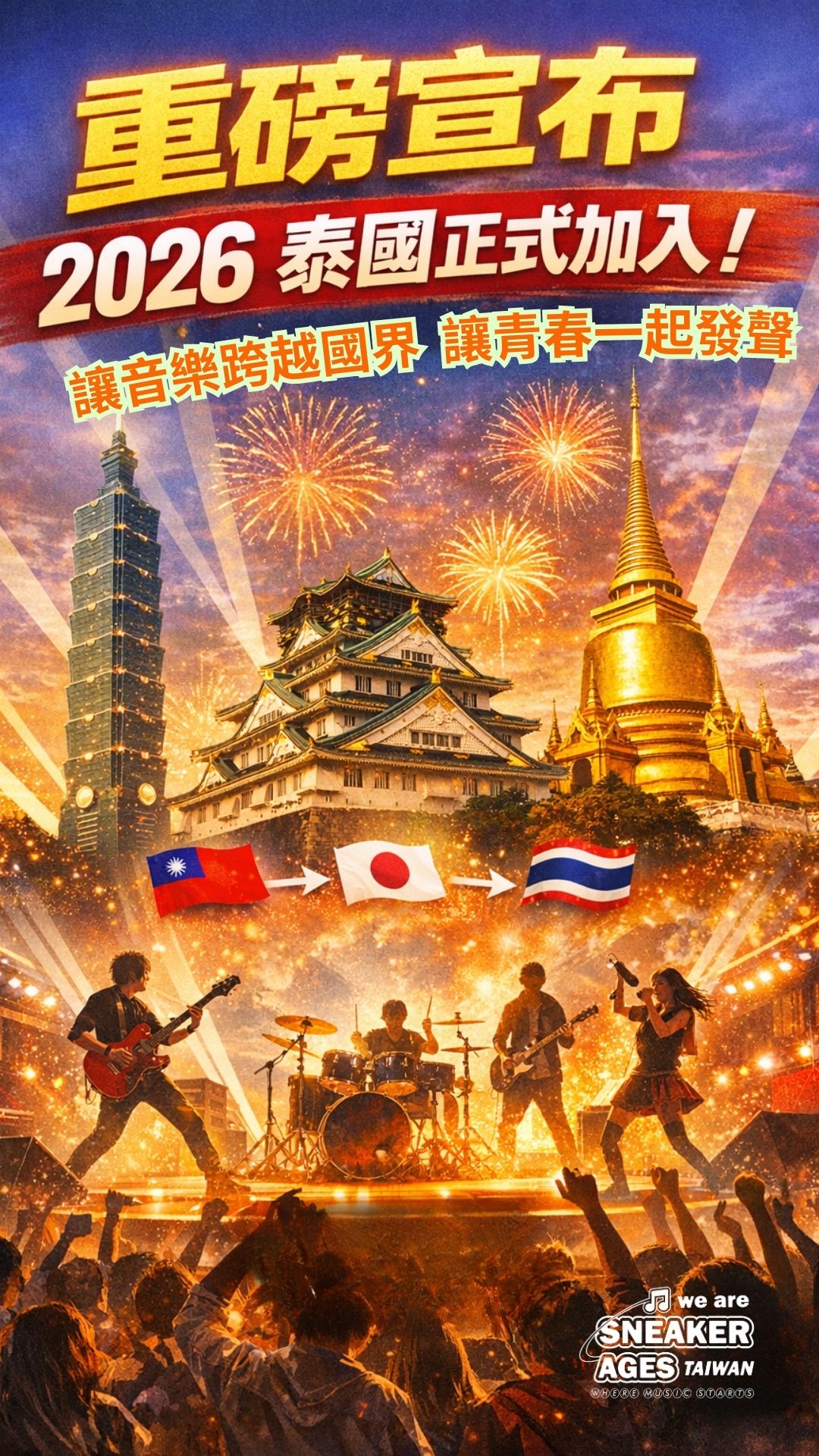由敦煌樂器主辦的 WE ARE SNEAKER AGES 全國高校校際盃樂團大賽,正式迎來重要里程碑。繼日本、台灣長期交流合作後,泰國已確認將於 2026 年正式加入賽事體系,標誌著 WE ARE SNEAKER AGES 不再只是雙邊交流,而是正式邁向「亞洲級青年樂團音樂交流平台」。